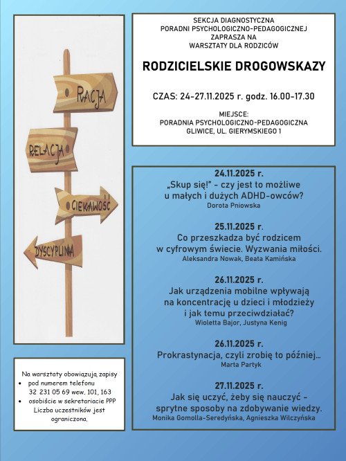 Sekcja Diagnostyczna Poradni Psychologiczno-Pedagogicznej w Gliwicach zaprasza rodziców uczniów gliwickich szkół na spotkania warsztatowe „Rodzicielskie drogowskazy", które odbędą się w dniach: