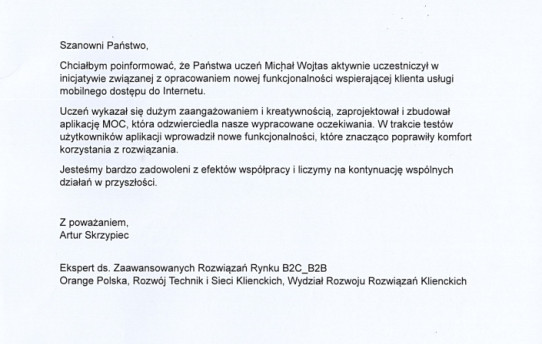 Rok szkolny 2025-2026 17.10.2025 Fale Innowacji Michał Wojtas (klasa 3P) otrzymał tytuł Innowatora Orange Polska za projekt Mobile Orange Compass. Gratulujemy! Galeria zdjęć Powrót do listy