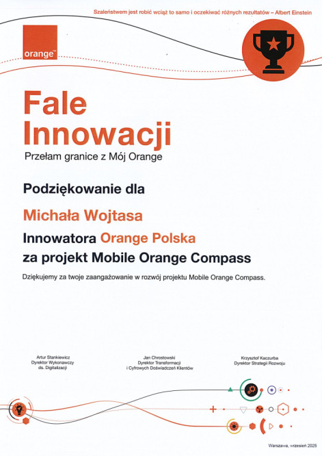 Aktualności ZSTI 21.10.2025 Fale Innowacji Michał Wojtas (klasa 3P) otrzymał tytuł Innowatora Orange Polska za projekt Mobile Orange Compass. Gratulujemy! Powrót do listy