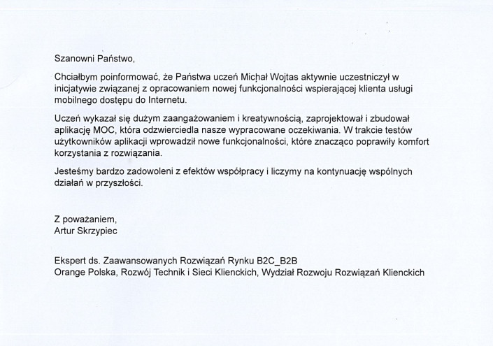 Rok szkolny 2025-2026 17.10.2025 Fale Innowacji Michał Wojtas (klasa 3P) otrzymał tytuł Innowatora Orange Polska za projekt Mobile Orange Compass. Gratulujemy! Galeria zdjęć Powrót do listy